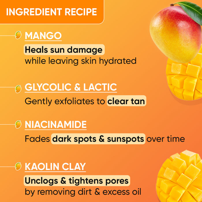 Get clear, tan-free & radiant skin in just 10 minutes with this non-drying detan clay mask. A modern take on ‘traditional ubtan’ packed with juicy mangoes, AHAs (lactic & glycolic) & niacinamide in kaolin clay, this pillowy soft clay mask not only removes stubborn tan with gentle exfoliation but also unclogs pores of impurities for soft, smooth skin instantly.