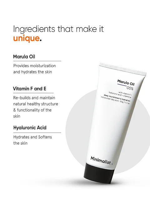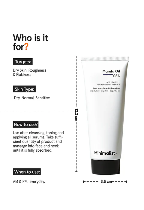 An everyday moisturizing cream with 5% Marula Oil, paired with Vitamin F and Vitamin E to nourish, moisturize and improve skin softness. It’s a heavy cream, suitable for dry/damaged to normal skin types.