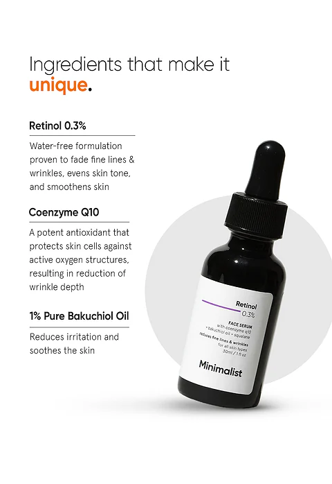 A highly stable & powerful anti-aging face serum packed with Retinol and antioxidant Coenzyme Q10. This water-free serum keeps Retinol stable & also nourishes skin.